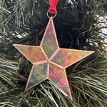 The star's glass changes color as it picks up different light and backgrounds, interesting and beautiful, the star can be hung by the attached red satin ribbon.