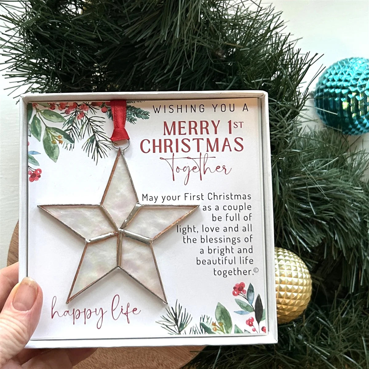 A truly one-of-a-kind gift for the holidays. Beautiful 4" ever-changing clear iridescent stained glass star boxed with joyful message celebrating their first Christmas together. A thoughtful gift that will be appreciated and cherished by the recipients, perfect for newlyweds or a new couple celebrating their first Christmas.