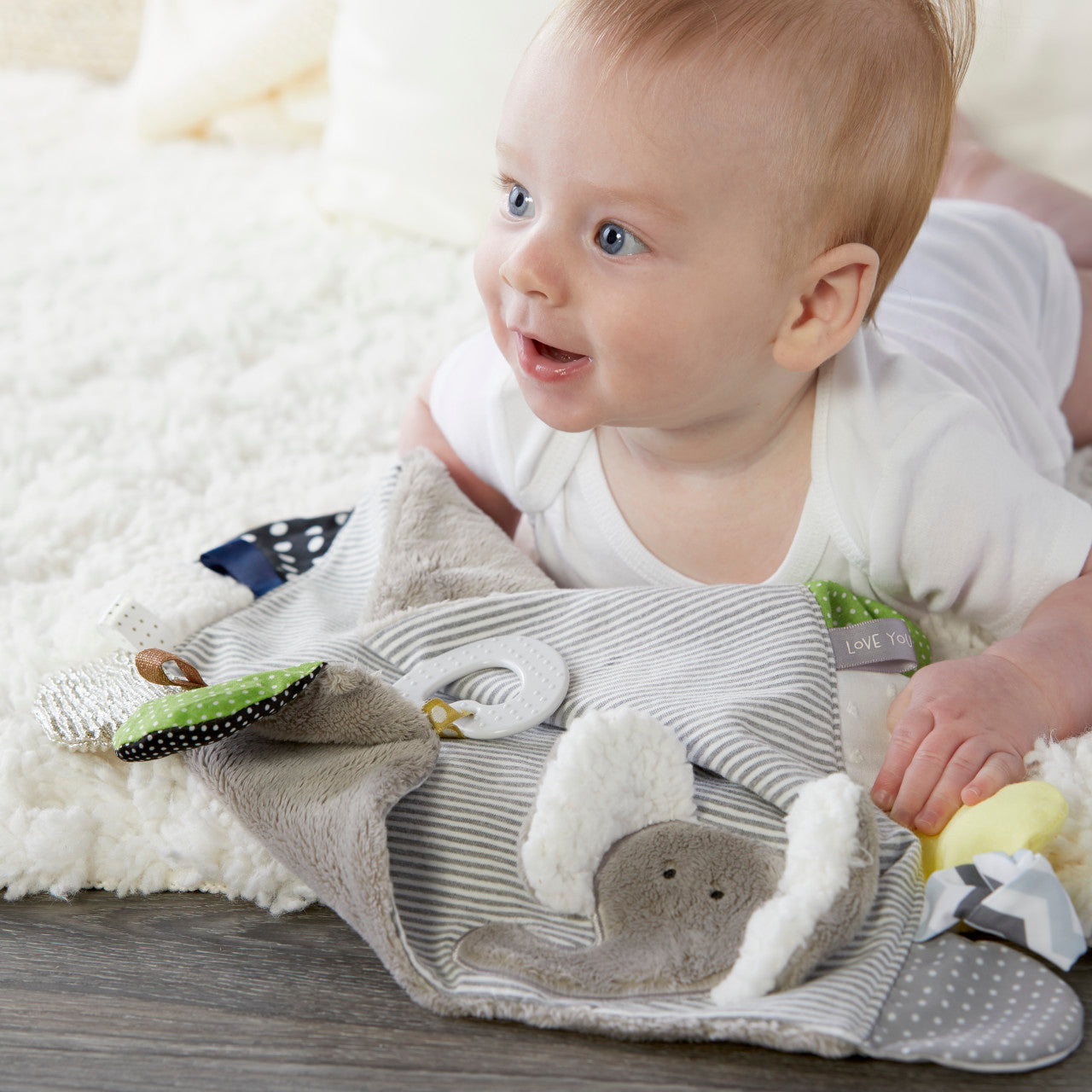 Get ready for some fun with our Activity Blankie - Elephant! Designed for little ones, this small blanket features a variety of sensory activities to stimulate their curiosity and motor skills. Keep your baby entertained for hours (or at least a few minutes) with this playful and adorable elephant blankie.