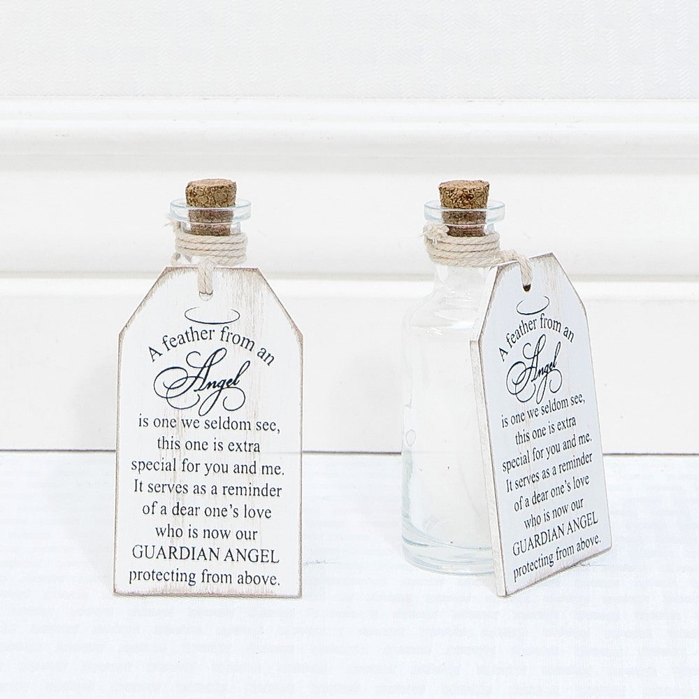 Keep the memory of a loved one close with our Angel Feather in Bottle with Message. The distressed wooden tag and bottle set features a heartfelt message and serves as a reminder of their love and protection from above. Measuring 2" x 4" x .25", it's a special keepsake to cherish.