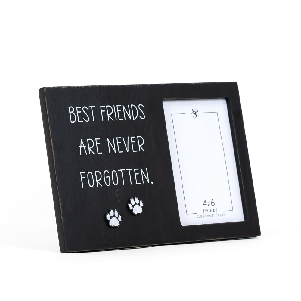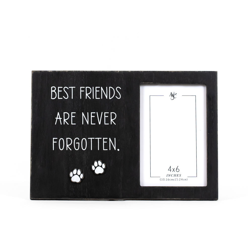 Designed in a sleek black and white color scheme, this frame seamlessly blends with any decor. With the heartfelt inscription, "BEST FRIENDS ARE NEVER FORGOTTEN," this frame serves as a poignant reminder of the profound connections we forge with our closest companions. Whether it's a cherished pet or a dear human friend, this message encapsulates the everlasting impact they have on our lives. Crafted with meticulous attention to detail, this photo frame perfectly accommodates a 4x6 inch picture, allowing you to proudly display your most treasured memories. Its ideal size makes it versatile for placement on desks, shelves, or walls.