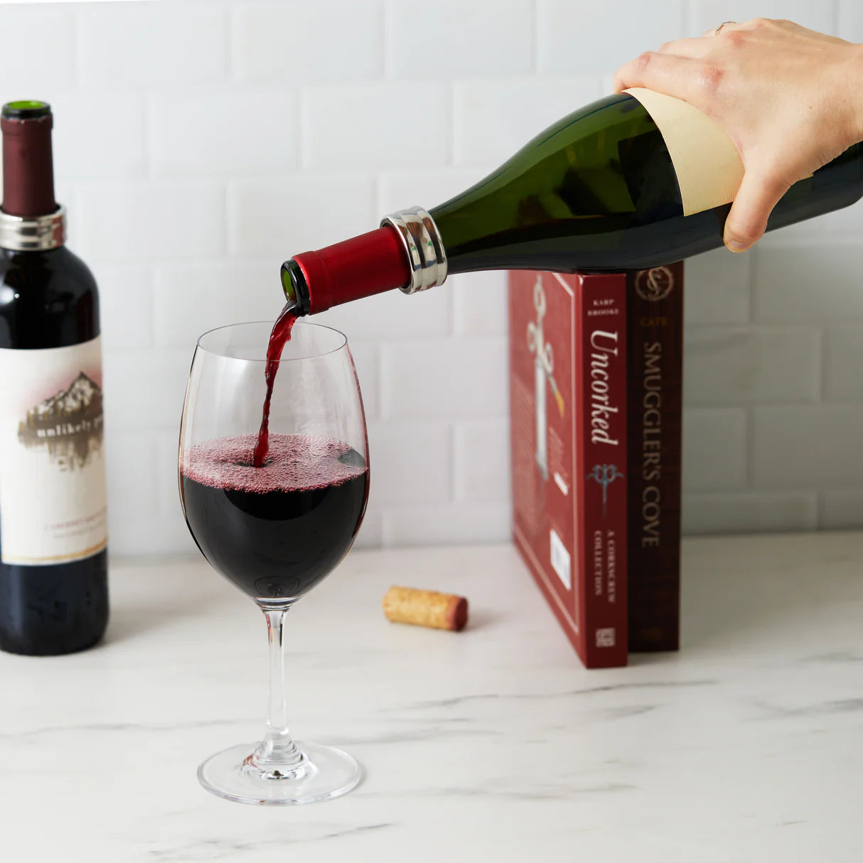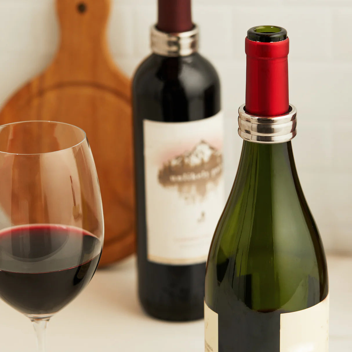 Our chrome-plated Circlet Drip Rings are one of the most effective wine essentials. This pair employs inserts of black velvet to soak up stray drops, keeping them from staining your clothes, wine label, or furniture.