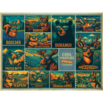 A Made-in-the-USA, eco-friendly 500-piece puzzle featuring a vibrant collage of retro-style travel posters inspired by Colorado’s most iconic mountain towns. Playful wildlife illustrations and bold, nostalgic color palettes give this puzzle strong regional and gift appeal, making it easy to merchandise for travel, outdoor, and lifestyle-focused retail environments.