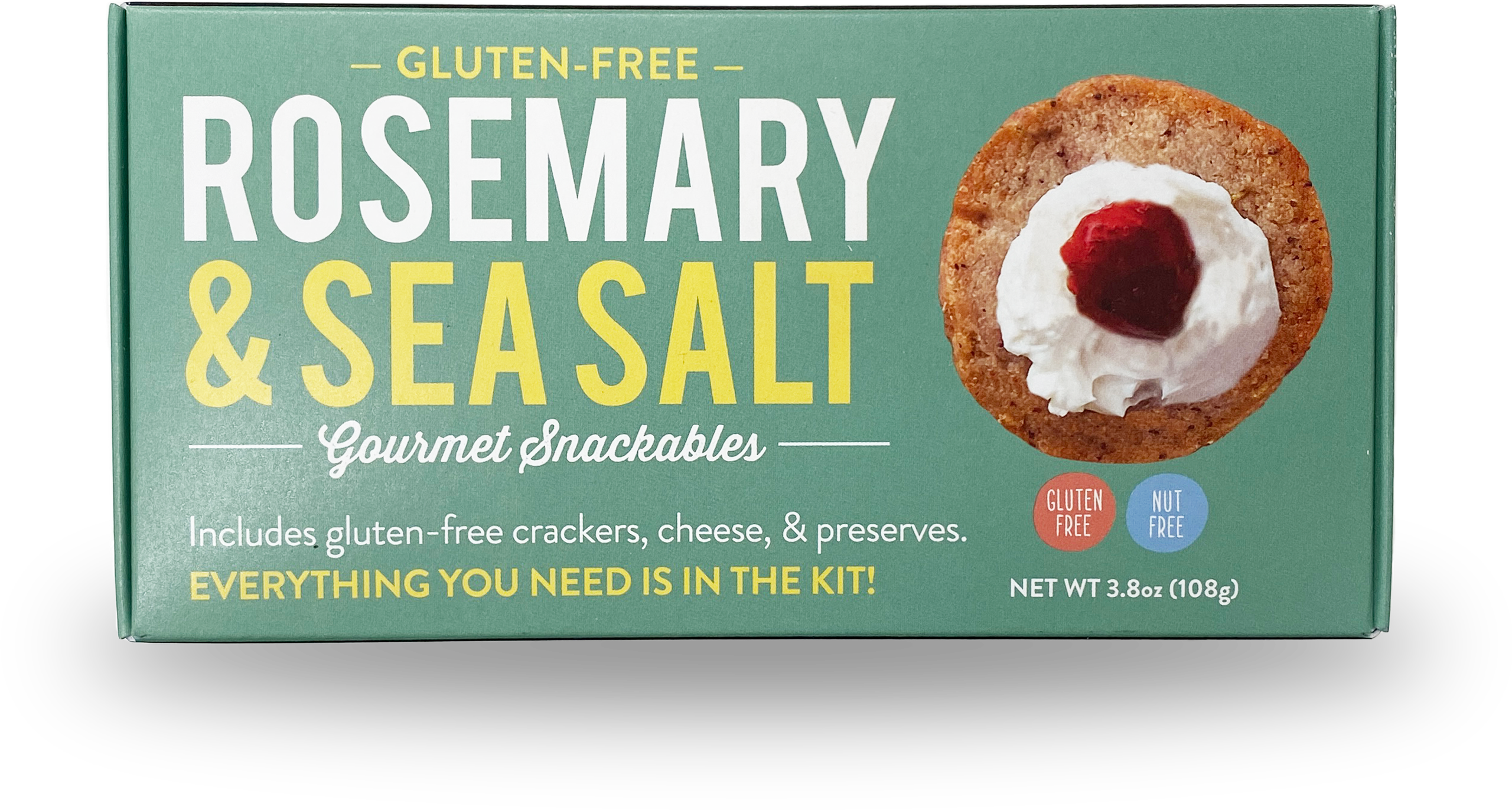 Rosemary & Sea Salt Gourmet Snackables include gluten-free crackers, cheese & preserves. This makes for a great snack to take anywhere. Gluten-Free + Nut Free