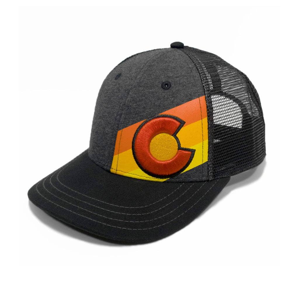 This famous canyon ski town is one of the most beautiful and extreme places to ski in the whole state of Colorado. Our Telluride Incline Hat features a constructed charcoal heather crown, a black bill with black mesh back, decorated with a 3D Colorado C embroidery with our retro color bands.