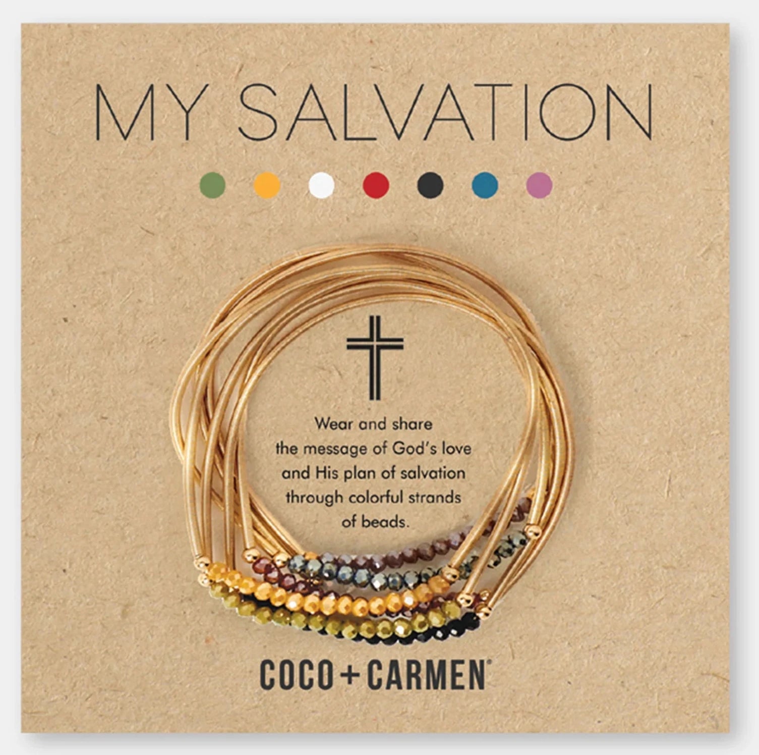 Wear and share God's love and salvation. Faceted glass beads and plated metal are uniquely crafted in the Salvation Gold Bracelet.