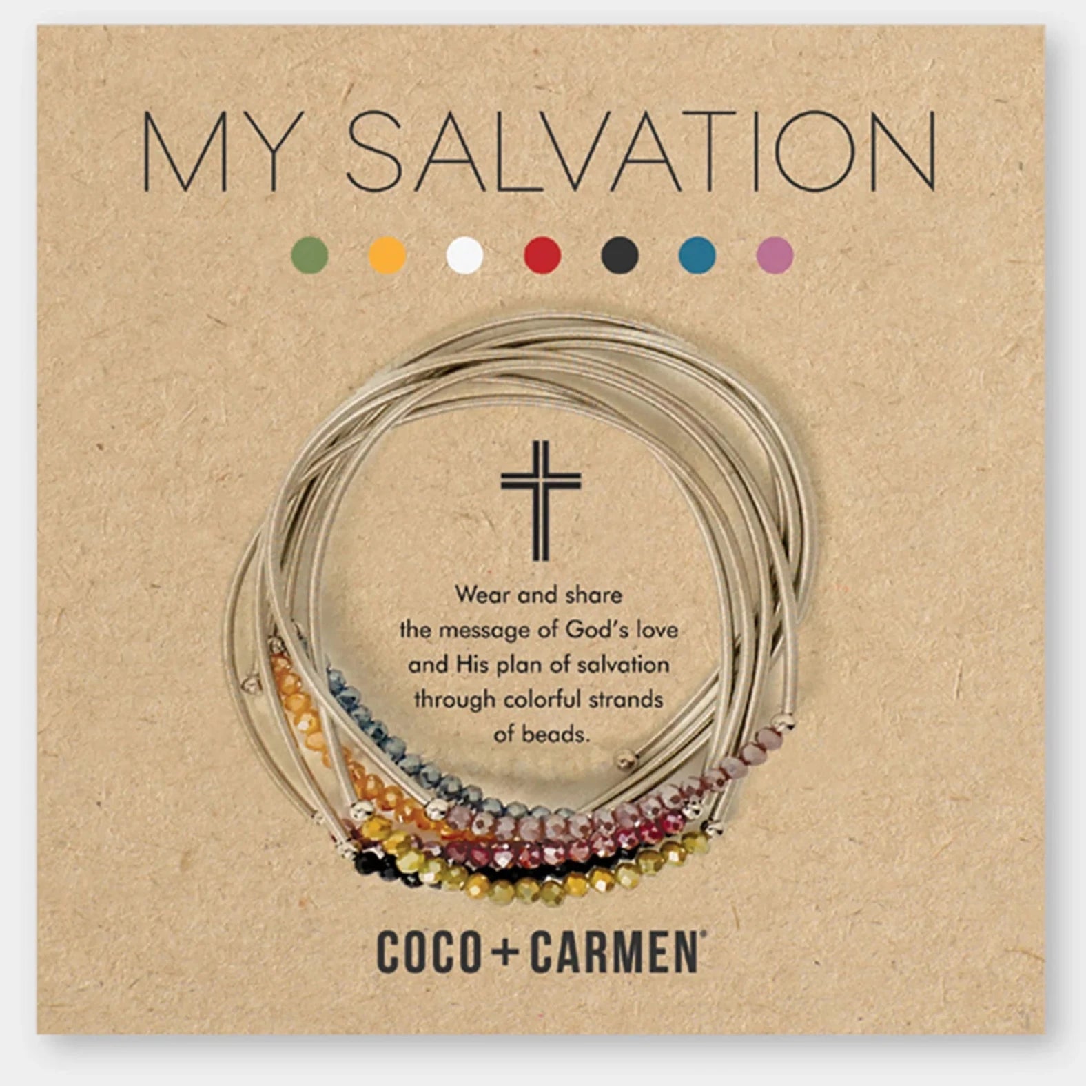 Wear and share God's love and salvation. Faceted glass beads and plated metal are uniquely crafted in the Salvation Bracelet.