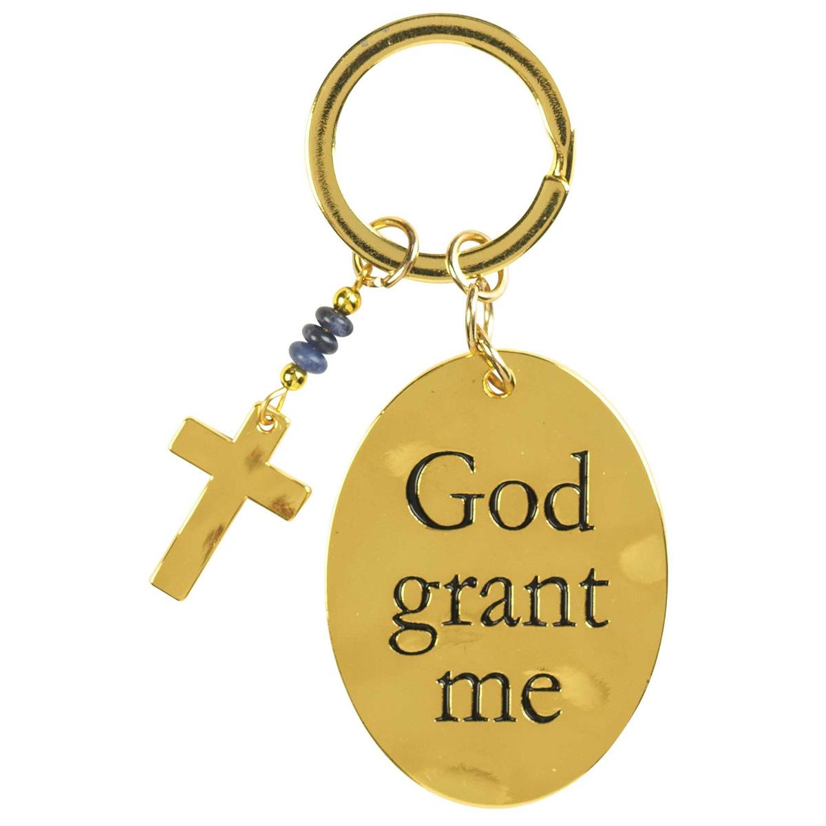 Gold tone metal keyring has oval pendant engraved on front with "God grant me" on front, and Serenity Courage Wisdom on Back. Metal oval is 1 3/8" x 1 7/8". There is also a small metal cross dangle with three black mini beads. Length of cross is 7/8". Pendant and cross have a wavy and brightly polished finish.