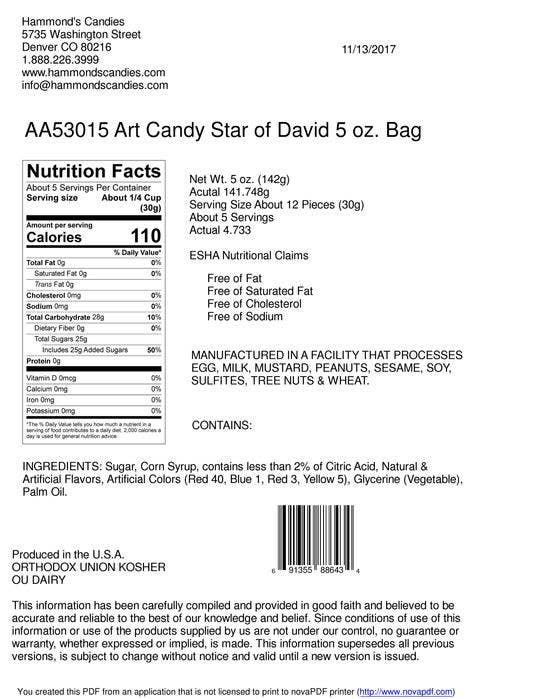 Looking for a delicious and unique Hanukkah treat? Look no further than Hammond's Star of David Blueberry Art Candy! These beautifully crafted candies are carefully handmade with a delightful blueberry flavor that's sure to satisfy your sweet tooth. Whether you're looking for a special gift or just a tasty treat for yourself, Hammond's Star of David Blueberry Art Candy is the perfect choice this Hanukkah! 5oz bag