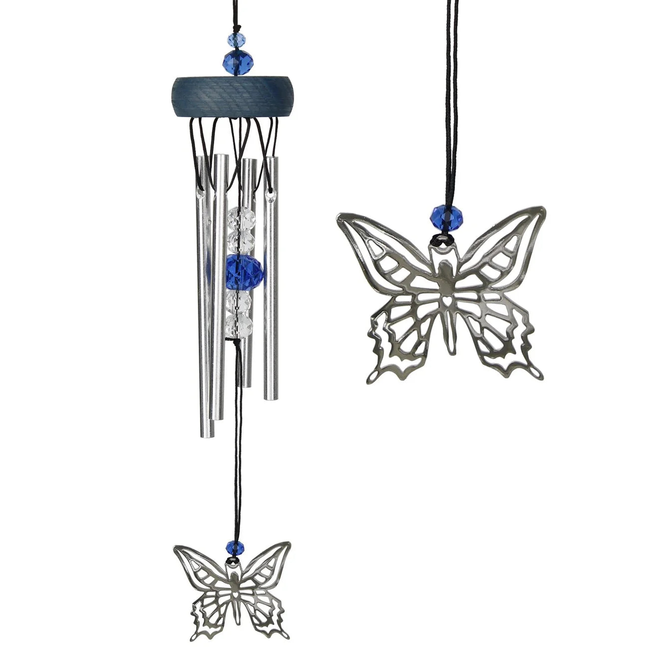 Delicate chiming combines with sparkling crystals and motifs from nature and mythology to enchant and delight. A silver butterfly flits and floats as the wind catcher (or, if you will, dreamcatcher) of this chime. Blue and clear faceted crystals embellish the chime, evoking the deep blue skies of summer when butterflies are most active.